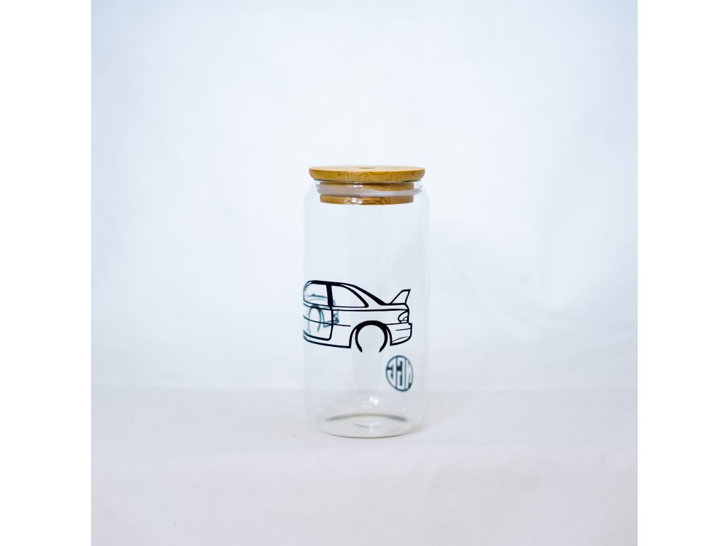 Sklenice s bambusovým víčkem a skleněným brčkem.
